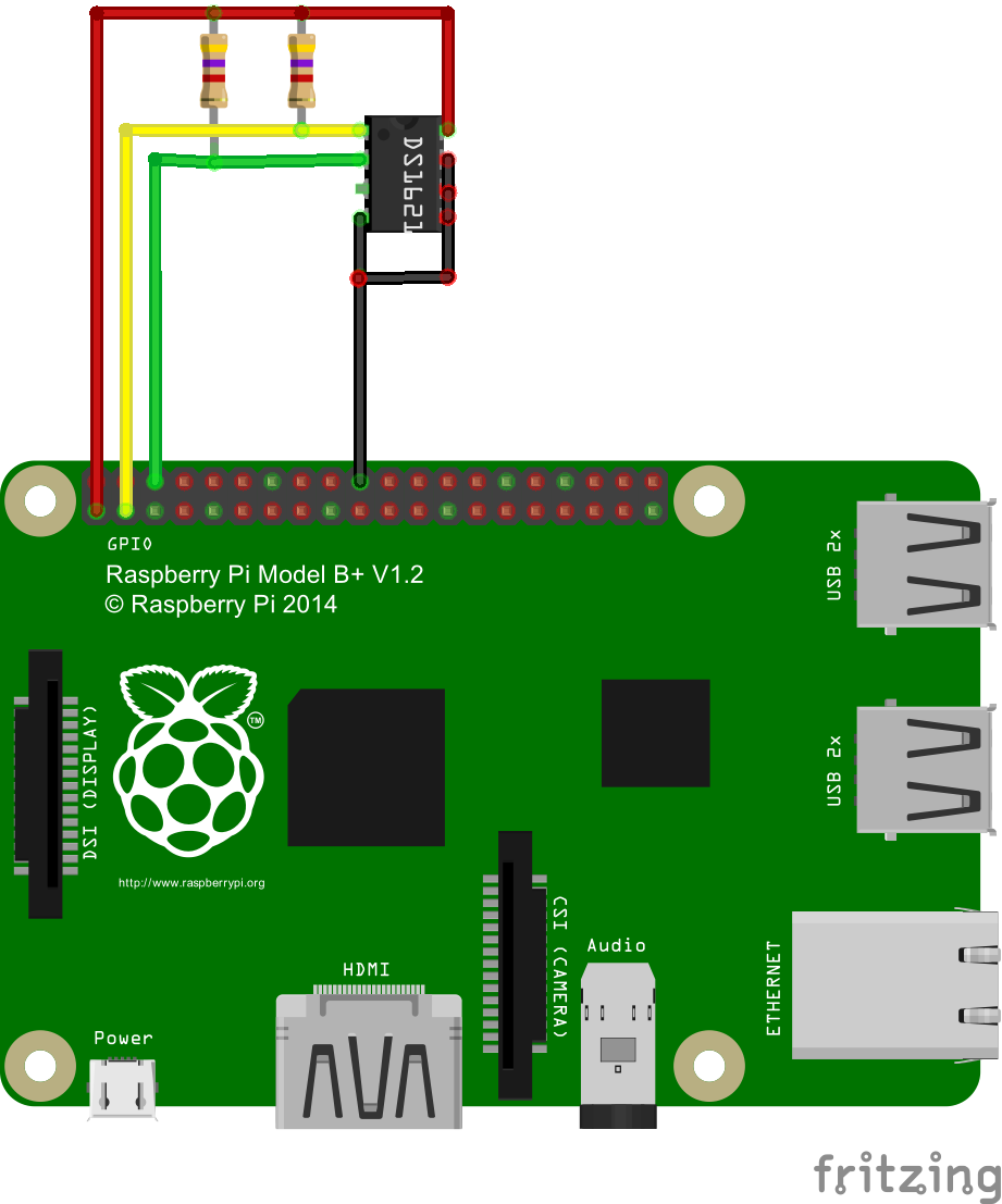 A lenti képen látható a DS1621 hőérzékelő szenzor bekötése. A modul i2c buszon kommunikál a Raspberry Pi-vel. A DS1621-nek 3,3V tápot adunk, az i2c vonalakat 1-1 4,7kOhm-os ellenállással tápfeszültségre kell húzni. Az A0, A1 és A2 kivezetéseket földre kötjük jelen esetben.